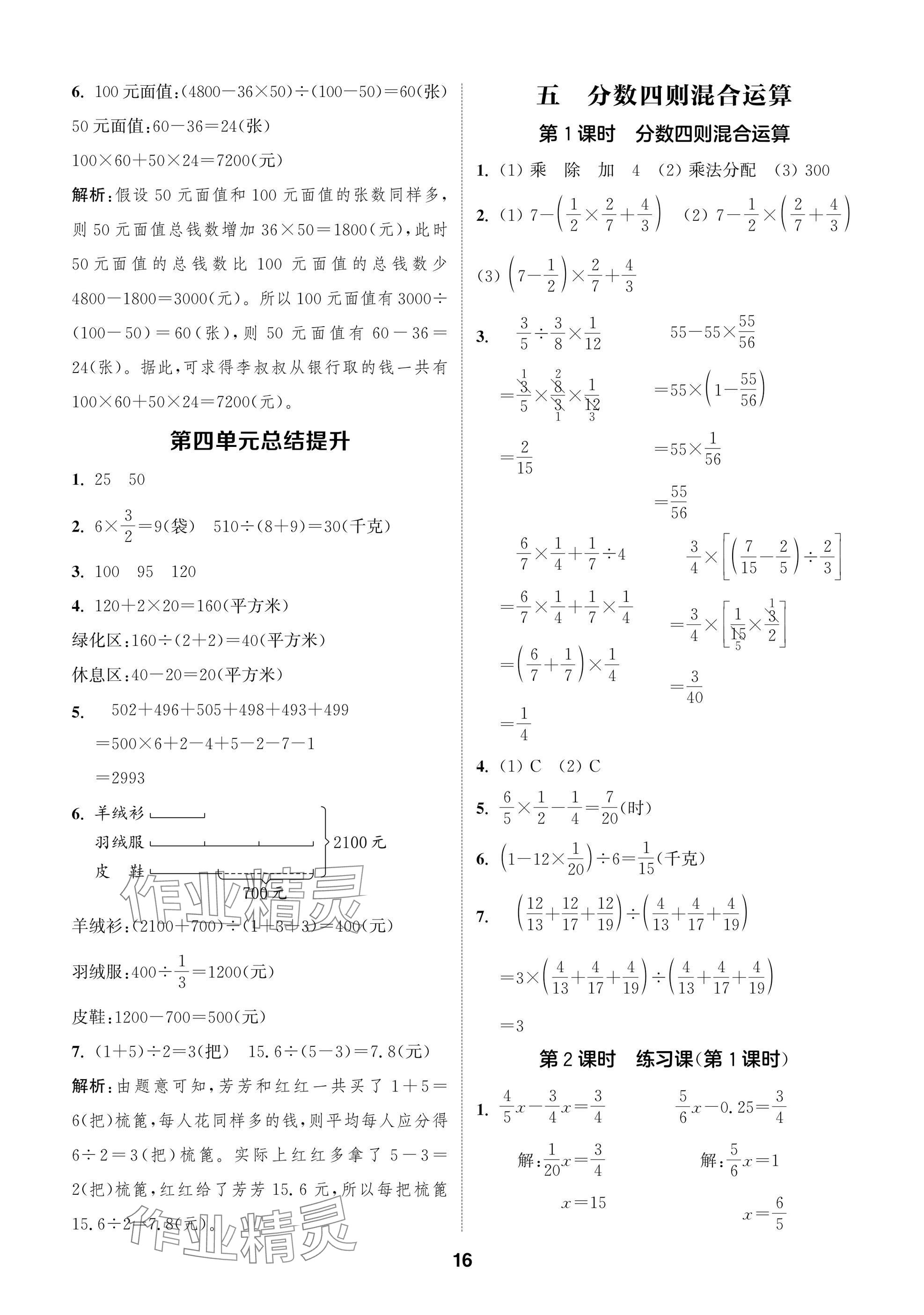 2025年课时作业本闯关练六年级数学上册苏教版参考答案第16页