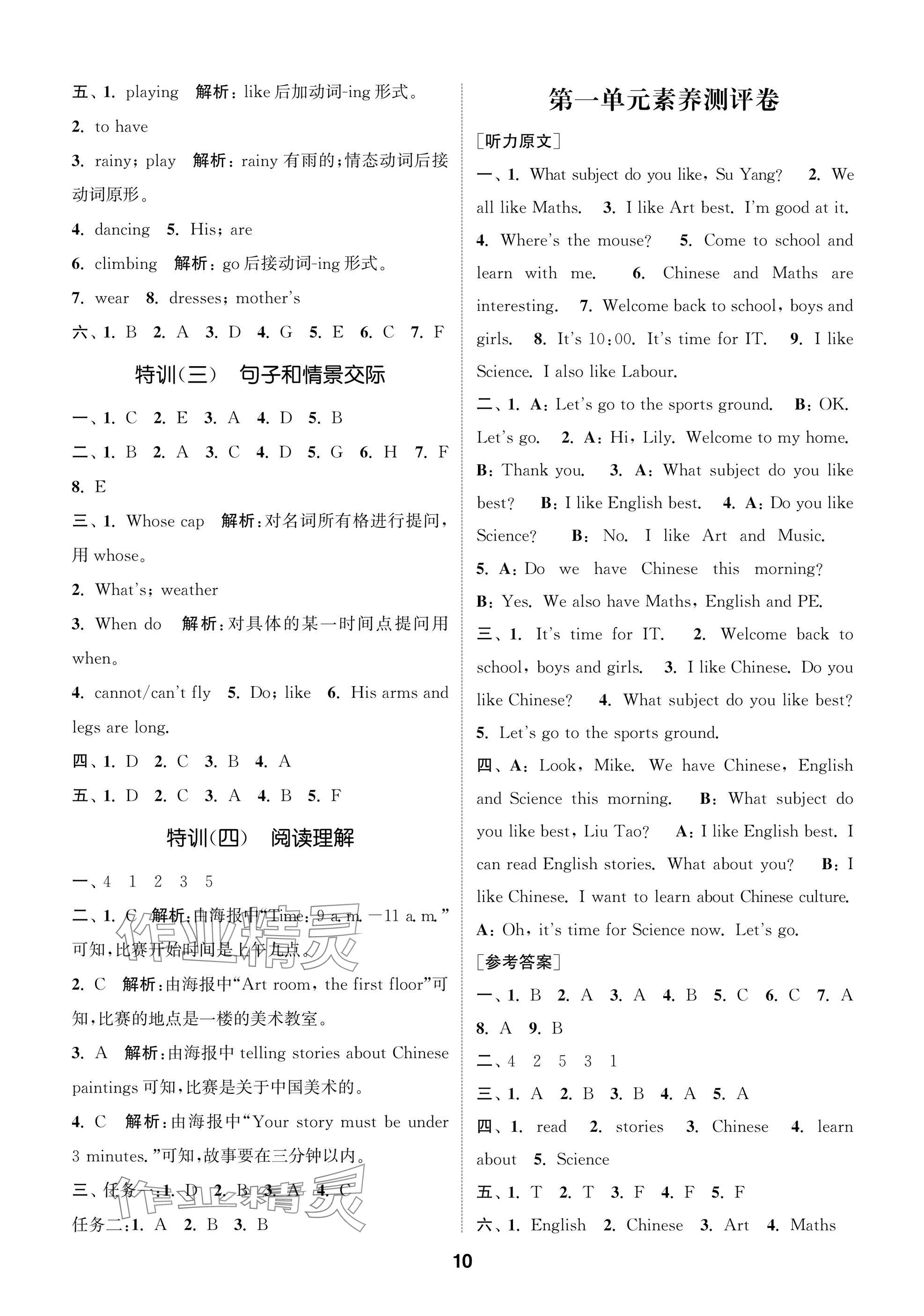 2025年课时作业本闯关练四年级英语上册译林版参考答案第10页