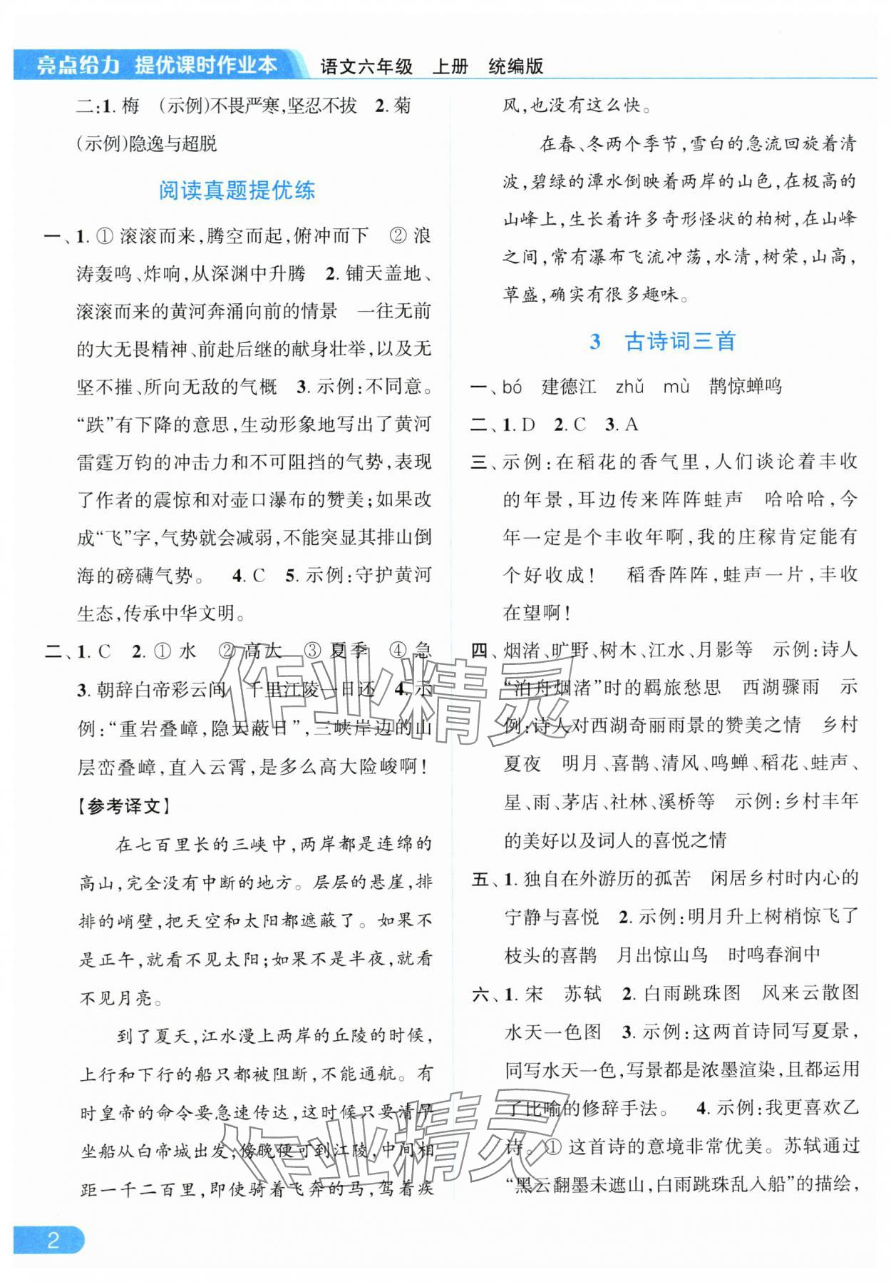 2025年亮点给力提优课时作业本六年级语文上册人教版参考答案第2页