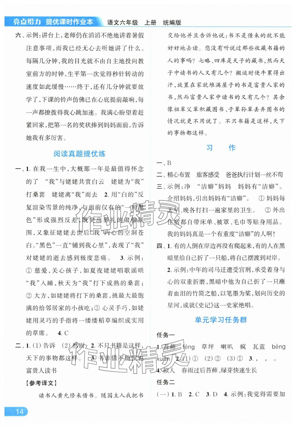 2025年亮点给力提优课时作业本六年级语文上册人教版参考答案第14页
