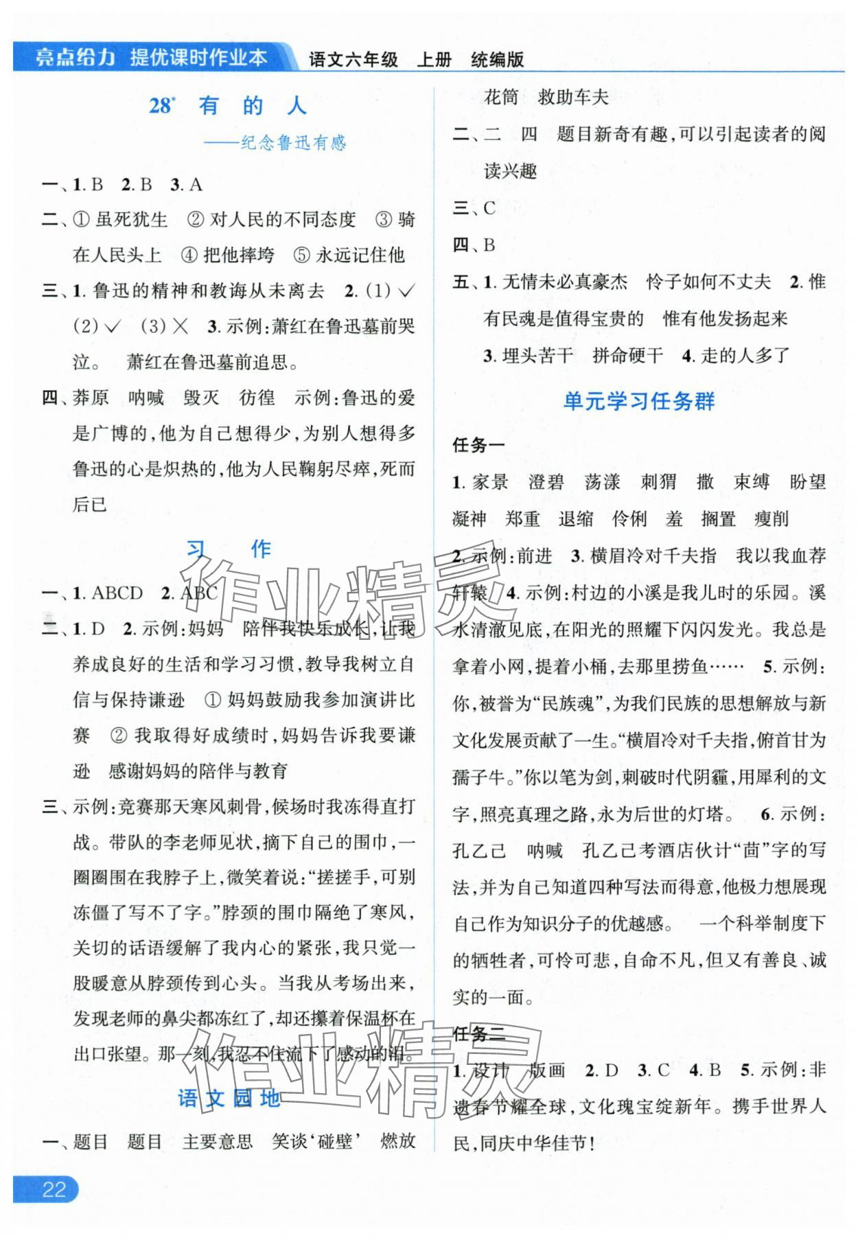 2025年亮点给力提优课时作业本六年级语文上册人教版参考答案第22页