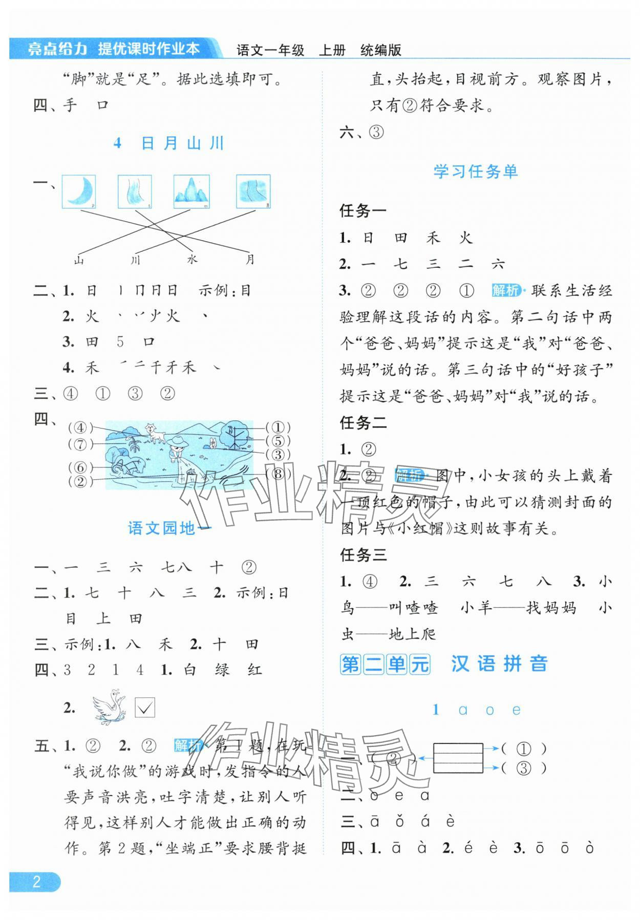 2025年亮点给力提优课时作业本一年级语文上册人教版参考答案第2页