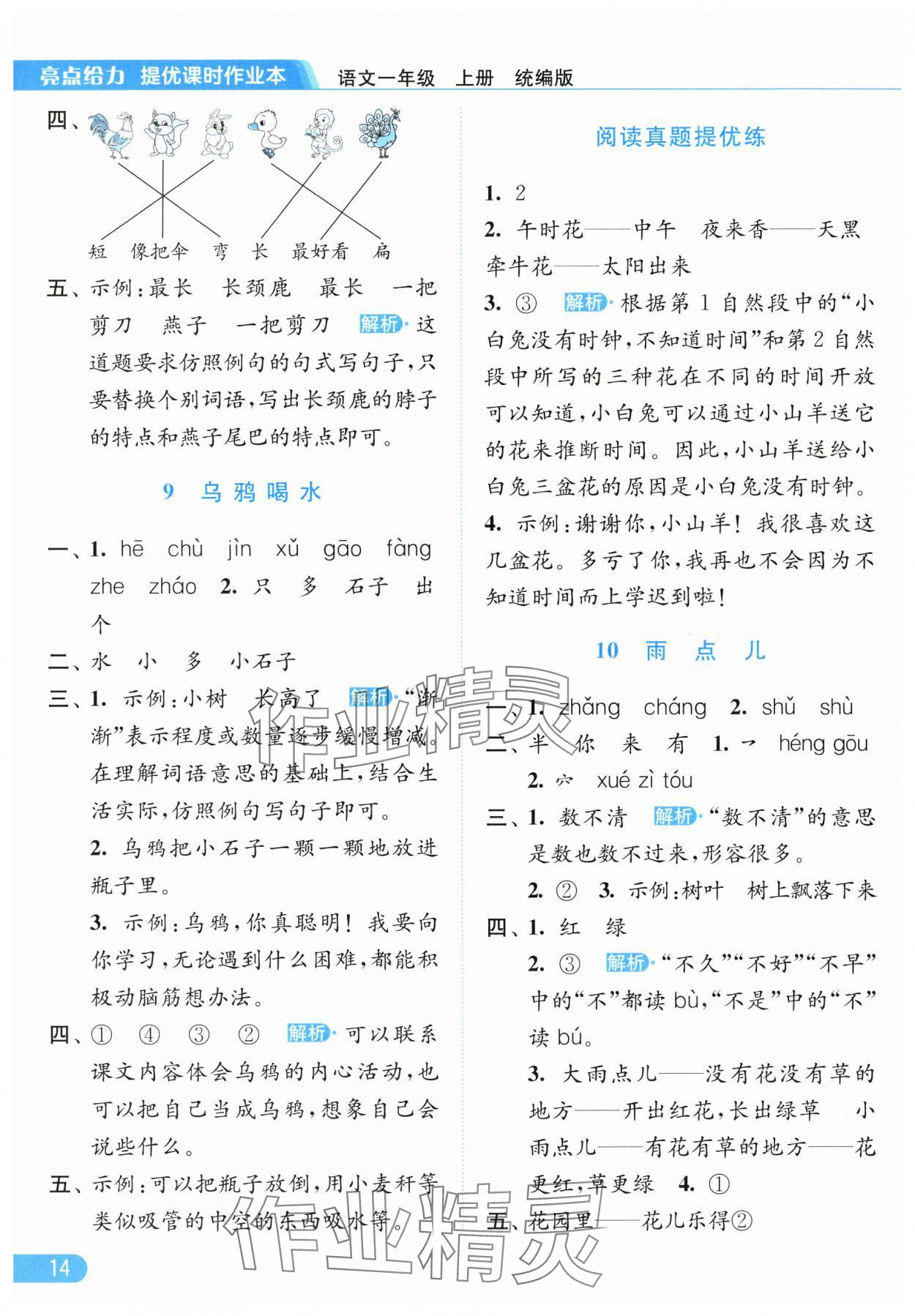 2025年亮点给力提优课时作业本一年级语文上册人教版参考答案第14页
