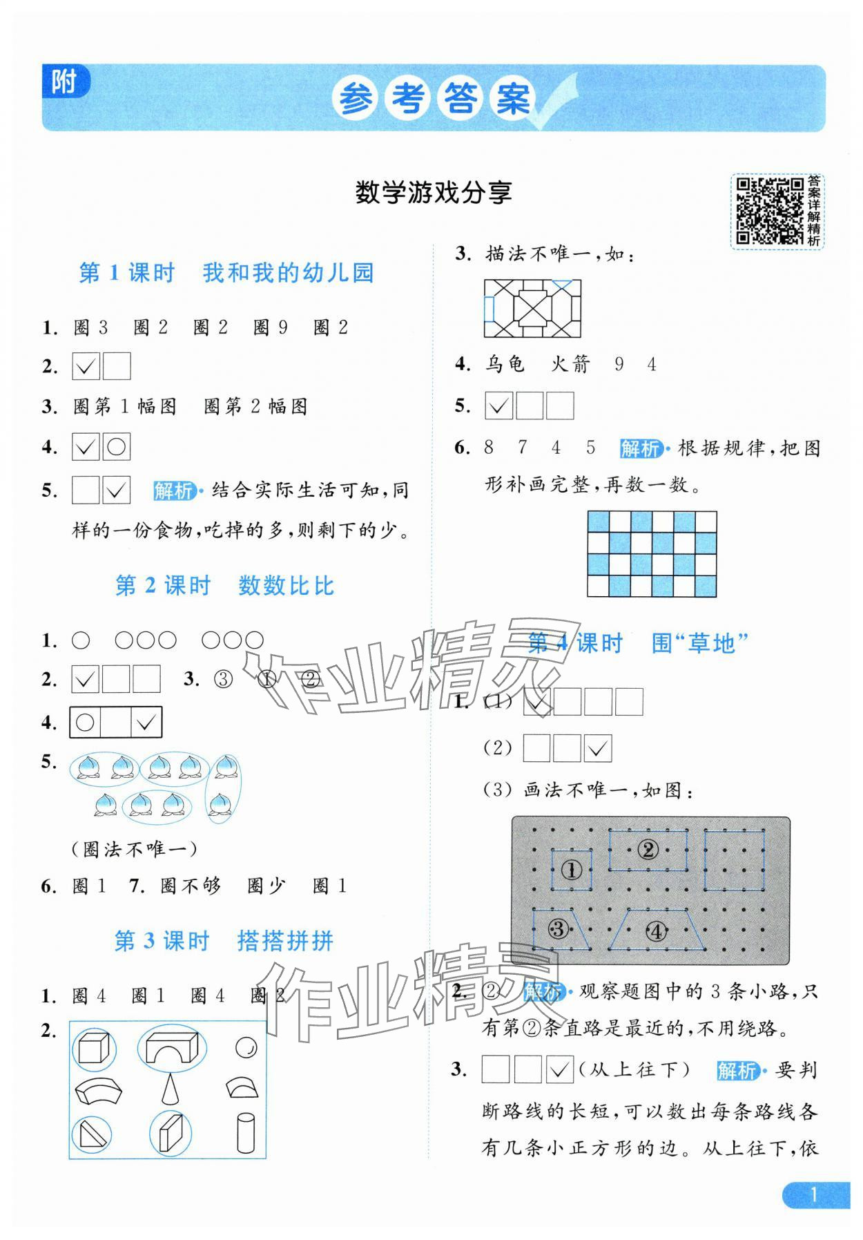 2025年亮点给力提优课时作业本一年级数学上册江苏版参考答案第1页