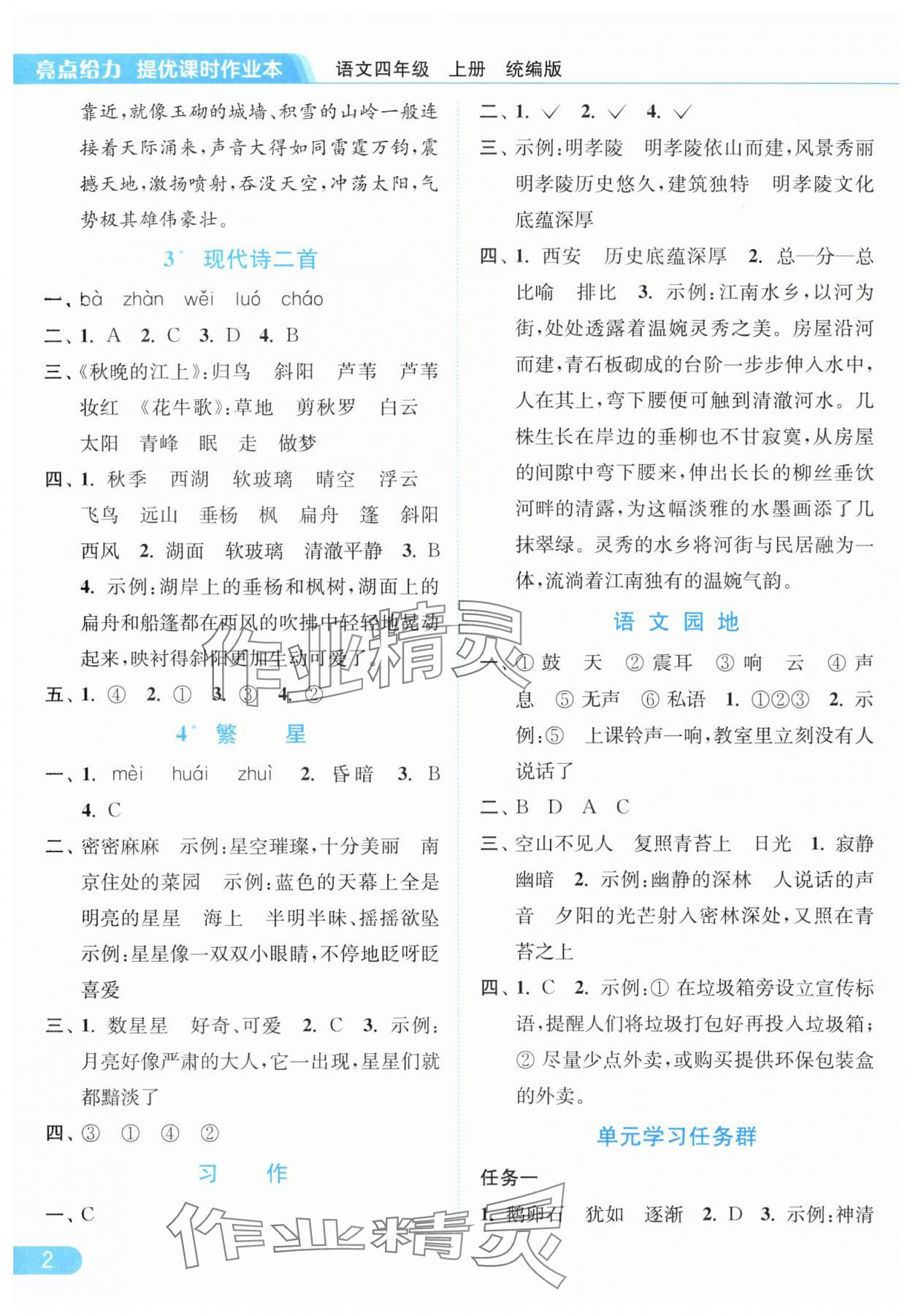 2025年亮点给力提优课时作业本四年级语文上册统编版参考答案第2页