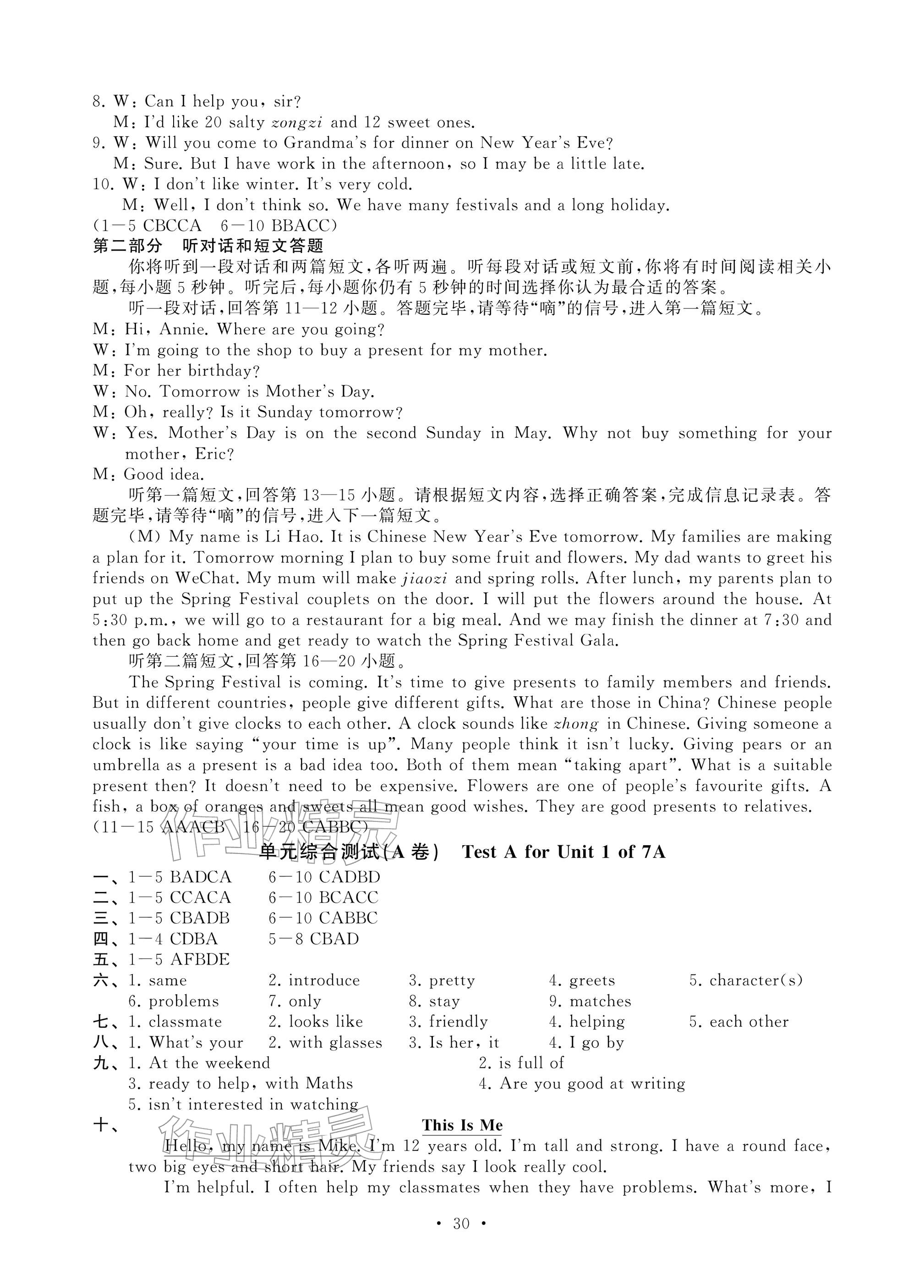 2025年综合素质随堂反馈七年级英语上册译林版苏州专版参考答案第22页